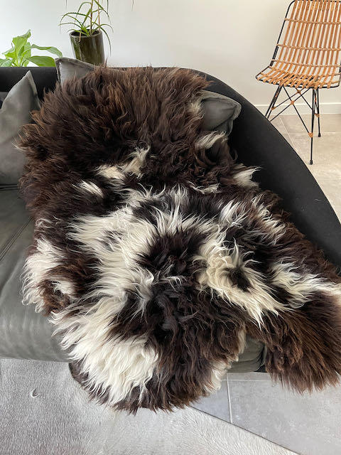 UitverkochtDonkerbruin/wit gevlekt Jacob schapenvacht XL