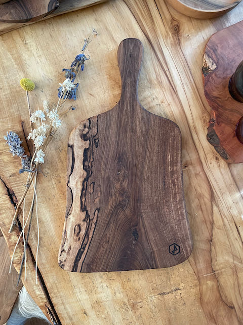 Deze tapasplank werd gemaakt uit een oude noten boom. De zwammen hebben prachtigen tekeningen in het hout gemaakt. Dit is dan ook een heel unieke plank.