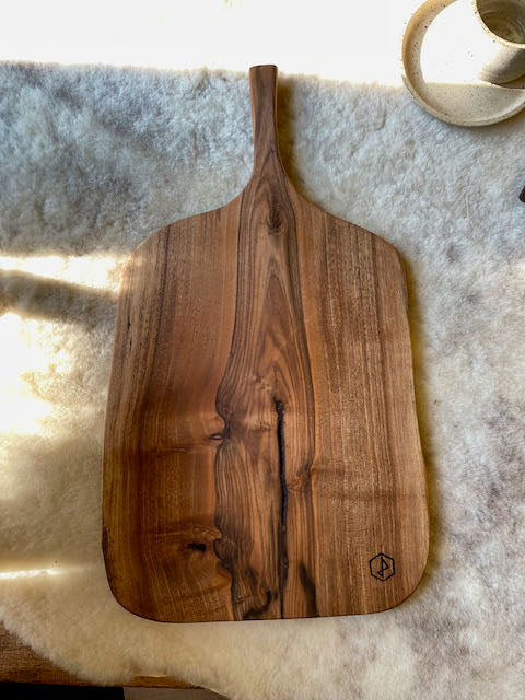 Deze tapasplank werd gemaakt uit een walnotenboom. Deze boom stond in een tuin te Brugge.