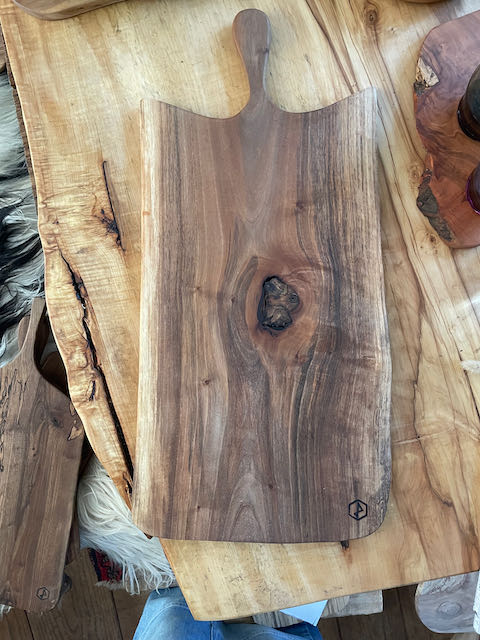 Deze tapasplank werd gemaakt uit een noten boom. Die stond in een tuin te Oedelem.