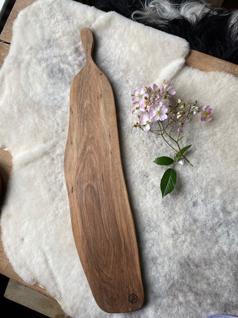 Deze tapas- snijplank werd gemaakt uit een notenlaarboom.