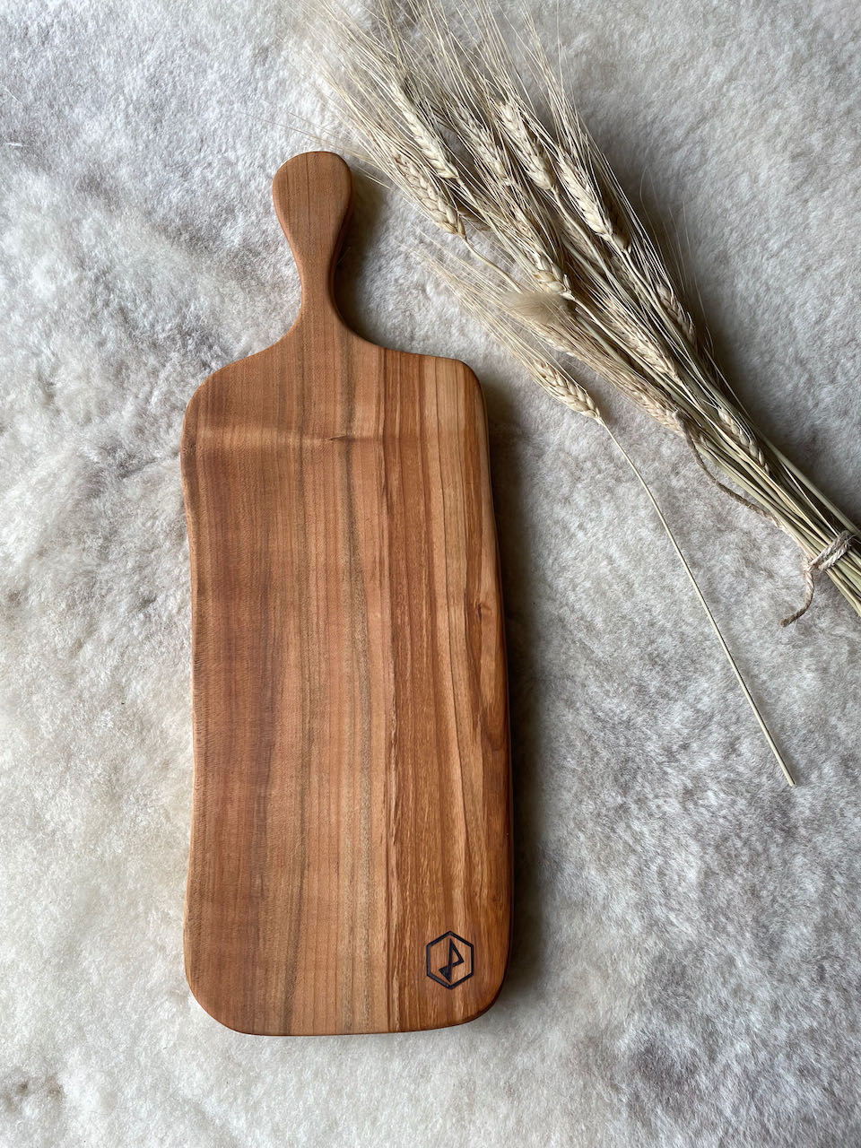 Dit plankje werd gemaakt uit een kersenboom, die stond in een tuin te Izegem. Ter info: de plank is groter dan op de foto, zie afmetingen.