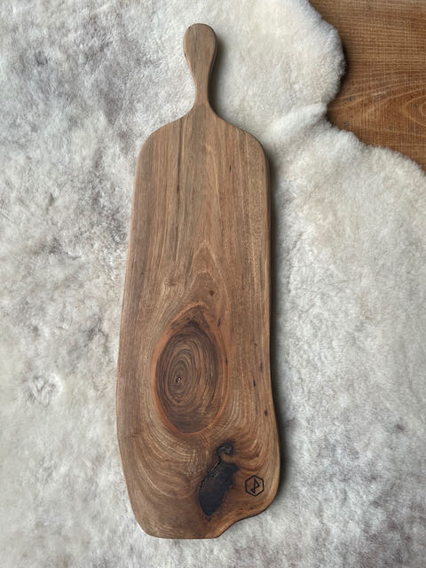 Deze mooie tapasplank werd gemaakt uit een notenboom. Die stond in een tuin te Bourgondië.