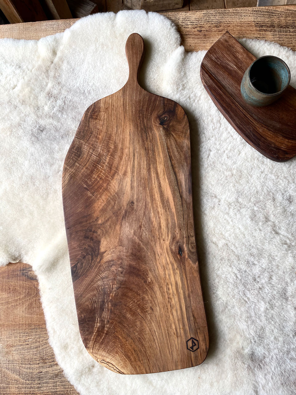Deze prachtige tapasplank werd gemaakt uit een oude notenboom. Die boom stond in een weide in Bourgondie. De prachtige tekeningen in het hout maken de plank echt wel uniek.