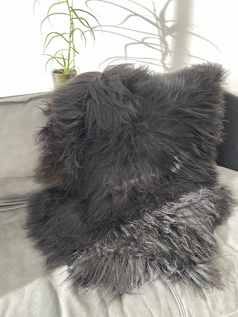 Deze zwarte Ijslandse vacht is naturel d.w.z. dat het niet in een kleurbad heeft gezeten. Op een natuurlijke manier gelooid wat de kwaliteit van de wol ten goede komt.